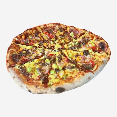 pomodoro, mozzarela, hovězí mleté maso, slanina, kozí rohy, čedarová omáčka, BBQ omáčka